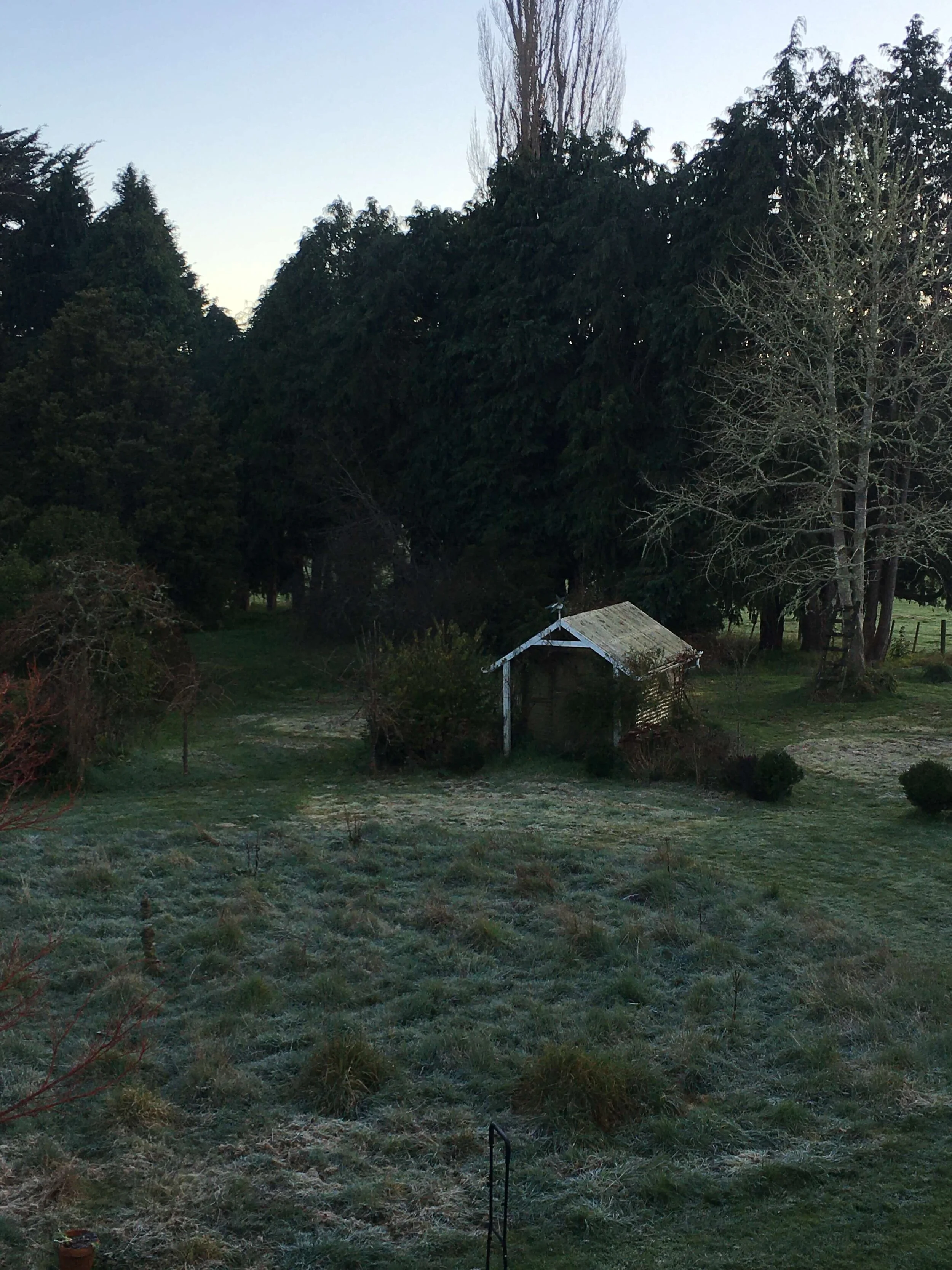 p.s. the photo full of green was taken early December 2019, two months after the labyrinth was created. The other photo was taken this chilly morning before the sun rose! The new labyrinth will go just to the right of the wee greenhouse.